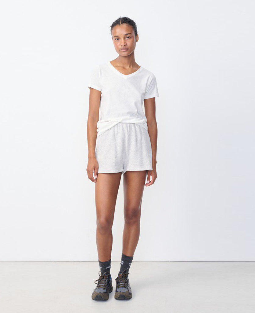 The Gami V-Neck SS Tee Tee is a versatile wardrobe essential. Its fitted cut, short sleeves, and classic v-neck offer a modern, flattering look. Wear it alone for subtle chic or layer it for a polished ensemble. Elevate your style effortlessly with this adaptable piece. Team it with everything from tonal denim to the brands best selling Pado Pant.