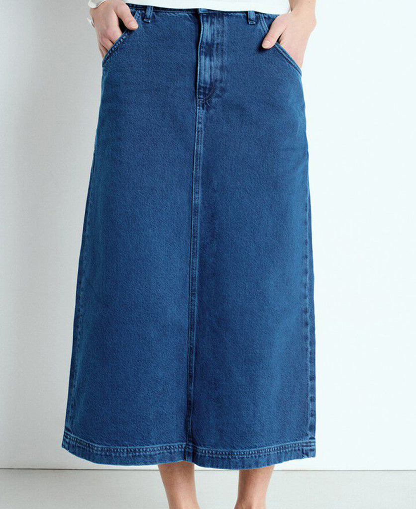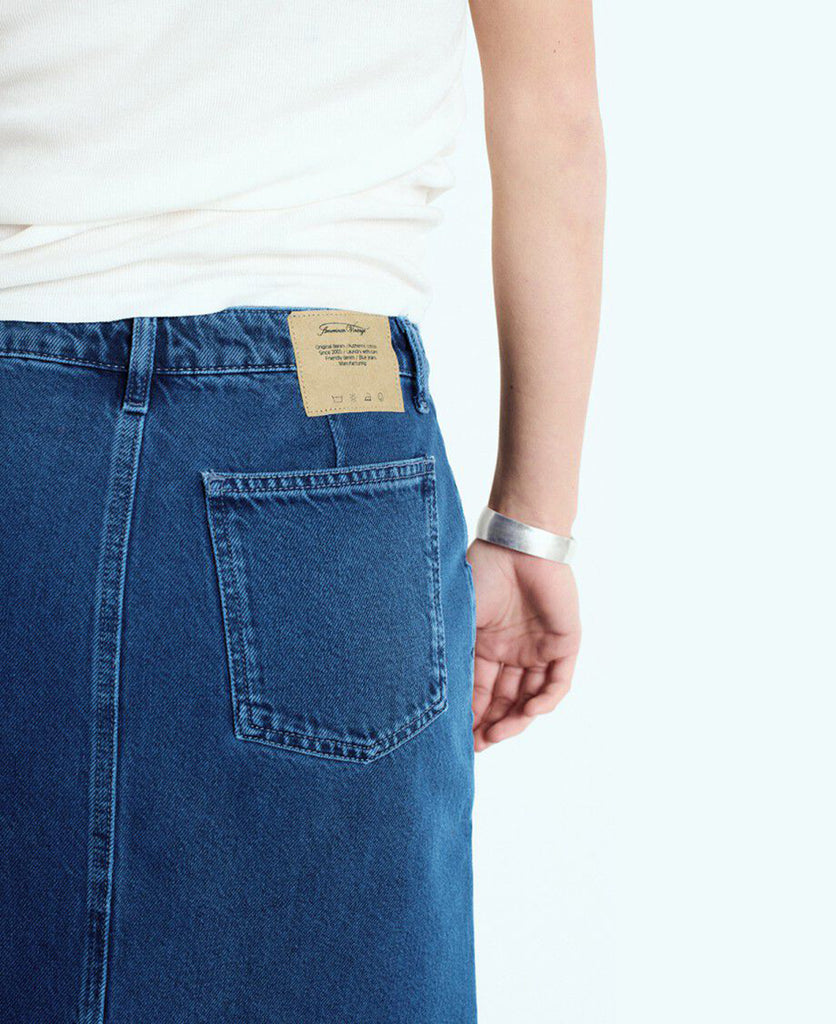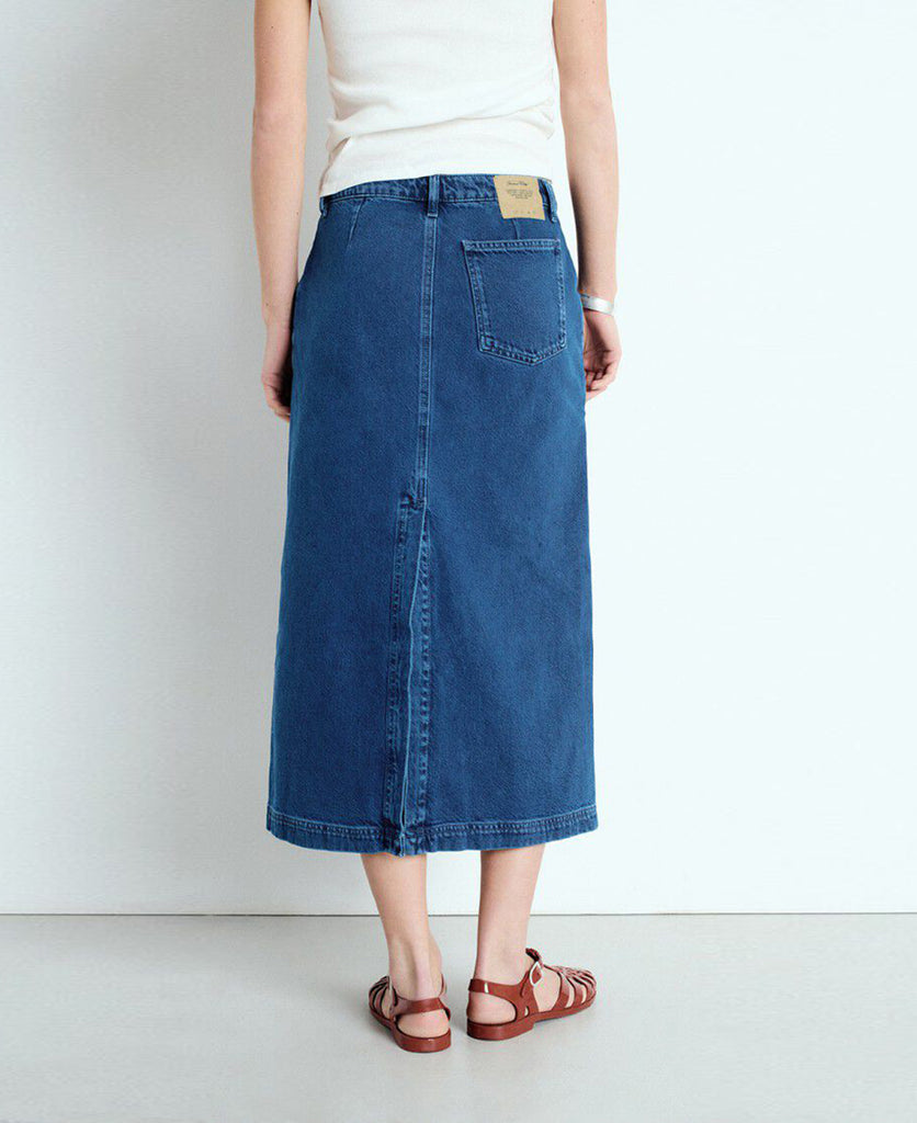 The Joy Denim Skirt by American Vintage boasts a sleek straight cut with a zip and button closure, belt loops, handy side pockets, a back patch pocket, and a cheeky split at the hem. Made from 100% cotton, this midi-length denim skirt is a fun and versatile addition to your wardrobe all year round.
