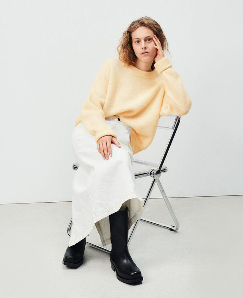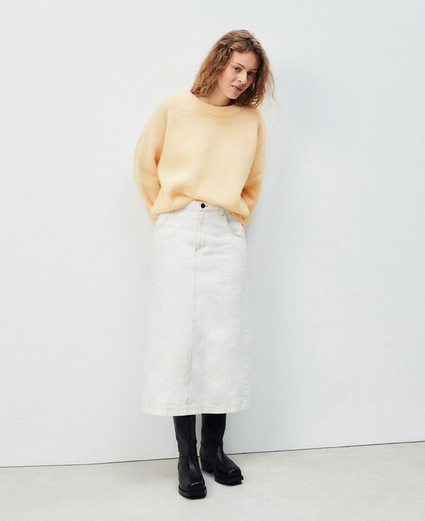 The Joz Denim Skirt features a chic A-line shape and a soft ecru shade, bringing a fresh, playful twist to your closet. Pair it with sneakers for a laid-back look or dress it up with heels for evening flair, this skirt effortlessly shifts from casual cool to classy charm.