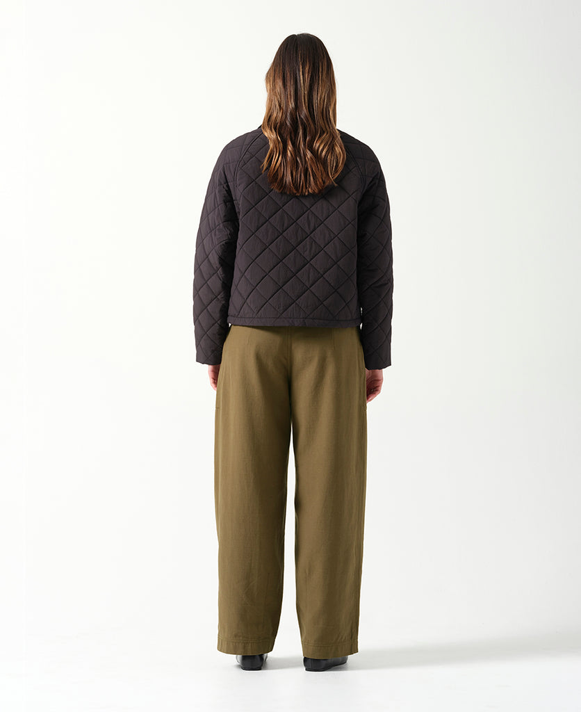 The perfect blend of practical utility and timeless design, the Catalina Jacket in Black is a versatile layer for transitional weather. Featuring a classic diamond-quilted pattern, this mid-length jacket is crafted from a durable polyester outer and lining for lightweight warmth. The design is elevated by a corduroy detailing at the collar and pocket flaps, adding a refined textural contrast.