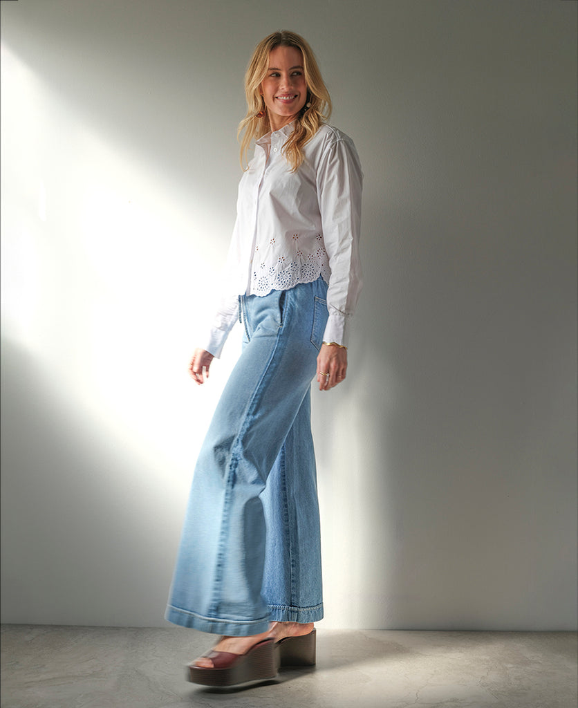 The Chloe Shirt is a playful new addition to your wardrobe. Cut in a cropped silhouette with full-length sleeves and a classic collar, it features delicate lace-like cutout detailing at the hem for a subtle, feminine touch. Effortlessly cute and easy to style, the Chloe Shirt pairs beautifully with high-waisted skirts, pants, or jeans for a fresh seasonal update.