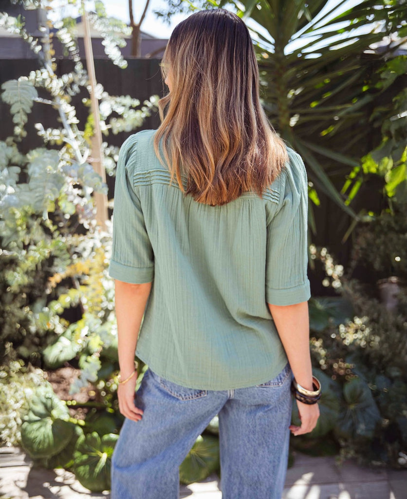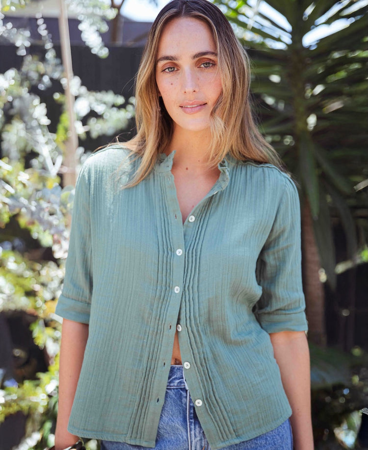 Stay cool this summer with the Hailie Shirt, crafted from lightweight and breathable double gauze fabric. Featuring a stand collar with a delicate frill and a button-through placket, this top offers both comfort and style. The 1/2 sleeve design and pleat details along the center front and shoulders add subtle sophistication, making it a perfect choice for the warmer months. Style with the Relaxed Jean Short by Marle and Federika Belt by Maison Hotel.