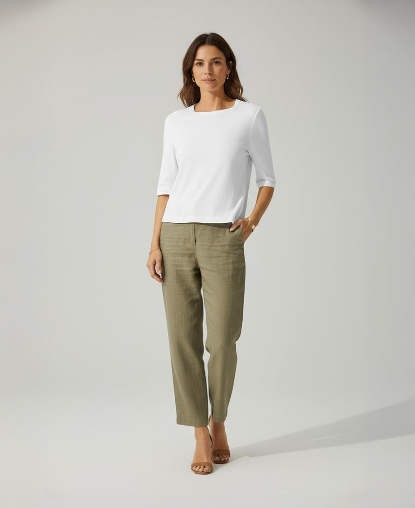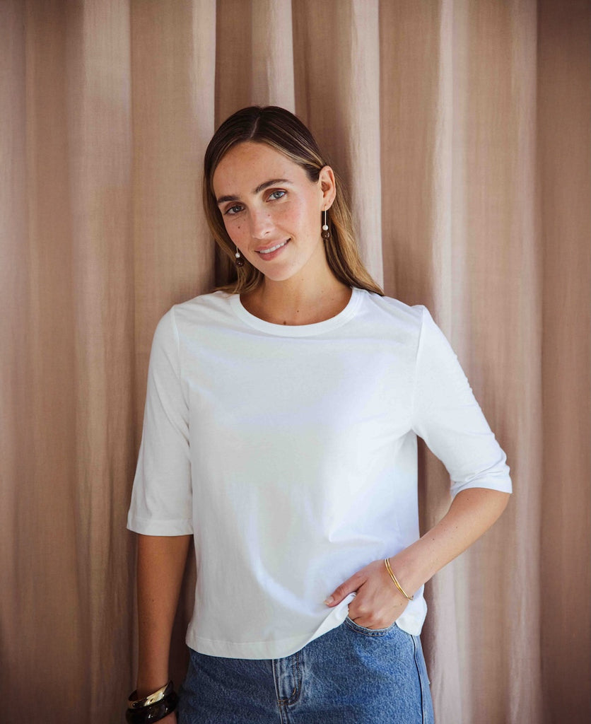 Inspired by the brand's best-selling Yasmine T-shirt, the Scarlett T-Shirt captures effortless style with its elbow-length sleeves and crew neck. Made from a soft knitted cotton/linen blend, it features inset sleeves and a straight hem for a versatile, refined look. Pair with the brands Margot Pant and sandals for easy-to-wear Spring style.