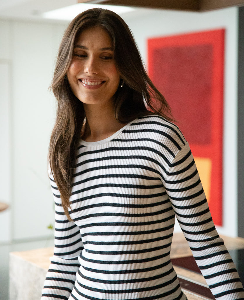 The Sharon Knit is made from 100% wool and features a timeless striped ribbed design in a versatile long sleeve silhouette. Crafted for everyday comfort, the ribbed texture adds subtle dimension while the classic stripes bring effortless style to any wardrobe. Perfect layered or worn solo, this piece transitions seamlessly from season to season. The fitted long sleeves and quality knit construction ensure a flattering fit that works for casual outings or relaxed office wear.