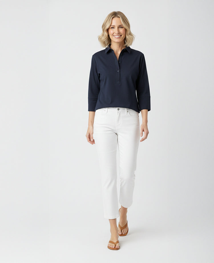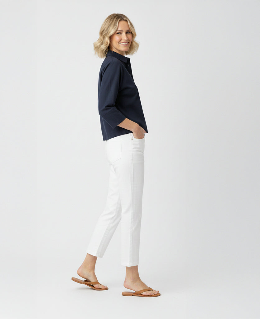 Crafted from light breathable cotton, the Sofia Shirt is perfect for warmer seasons. Its three-quarter sleeves and gently cropped cut create a refined silhouette that transitions seamlessly from casual to polished styling. Layer it with tailored trousers, flowing skirts, or tailored shorts for versatile everyday wear that balances comfort with understated sophistication.