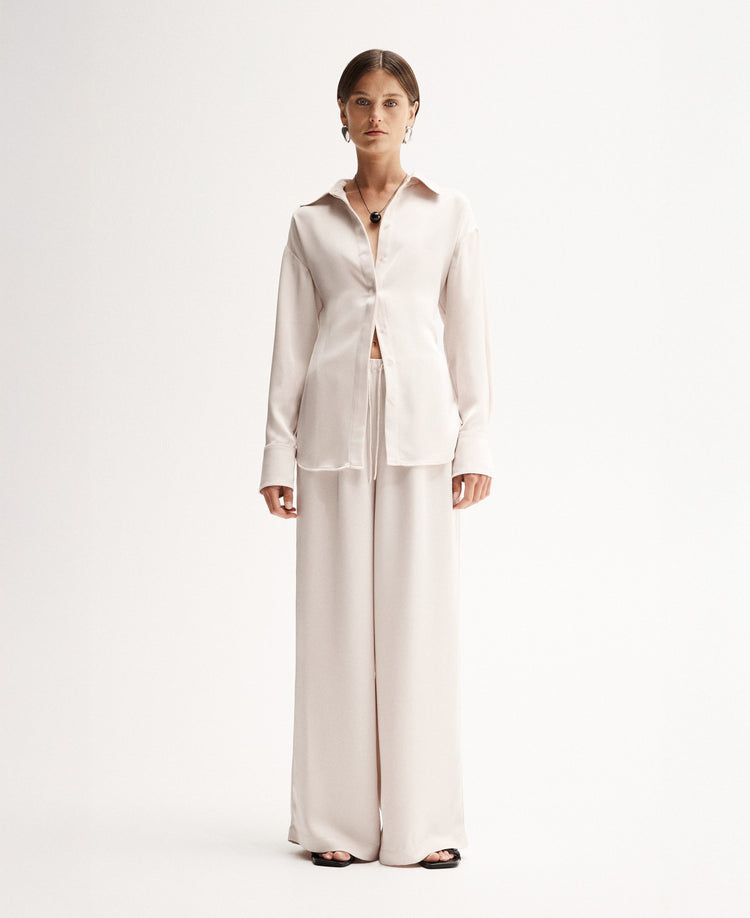 The Ella Shirt is back and better than ever, crafted from silky, double-sided recycled Japanese satin for that extra touch of luxury. Designed with a relaxed fit, it features an adjustable corset tie at the back, a timeless collar, full-length sleeves with drop shoulders, and buttoned cuffs, plus a button-up front. Pair it with the Mina Pant to turn heads or throw on your favorite denim for a laid-back weekend vibe with a fun twist.