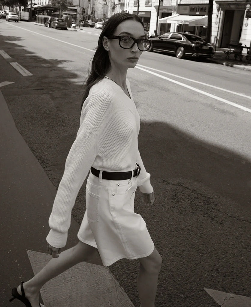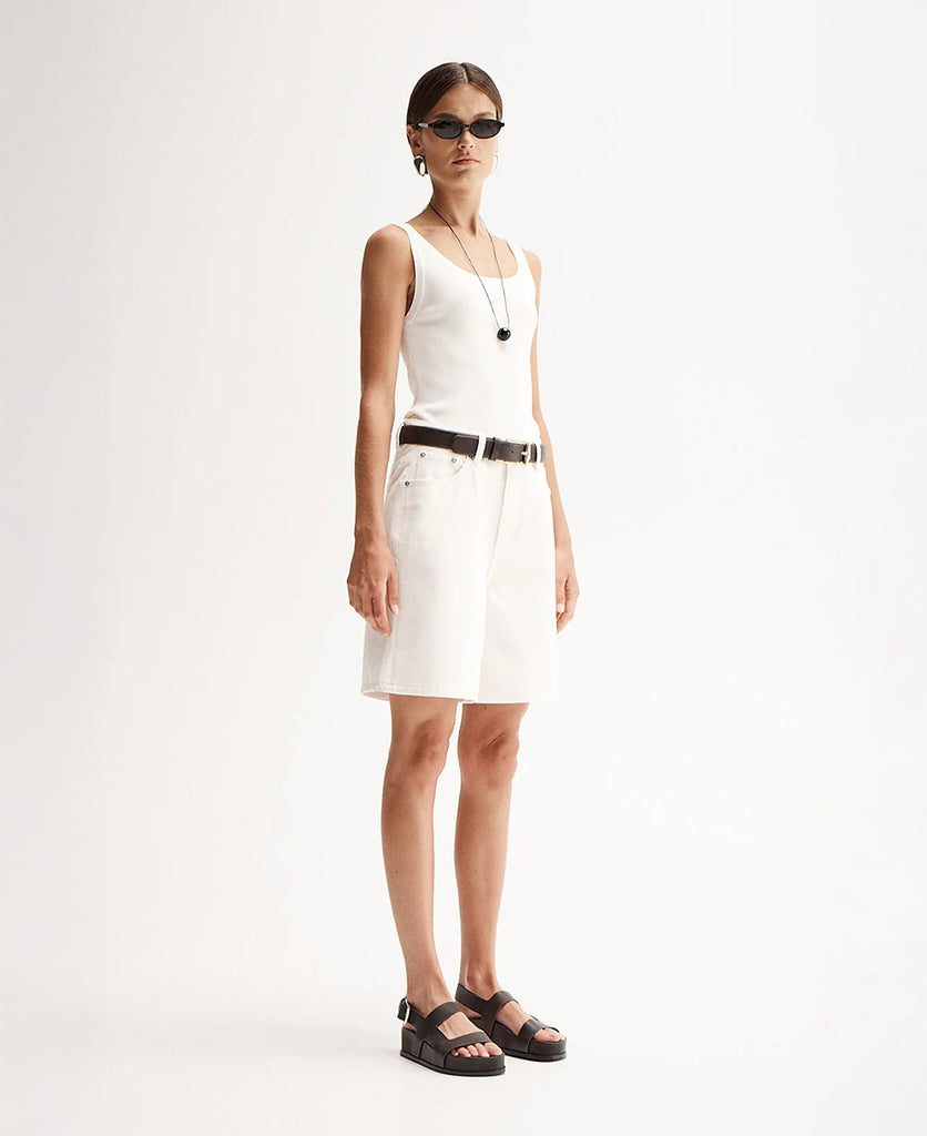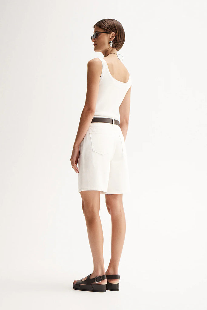 Odin Short is our new denim staple. Made of 100% cotton in our ivory wash, the Odin Short is cut to a high waisted fit with button and zip fly, classic 5-pocket styling, and a relaxed, wide leg silhouette. Sitting just above the knee, the Odin Short pairs perfectly with our range of premium basics.
