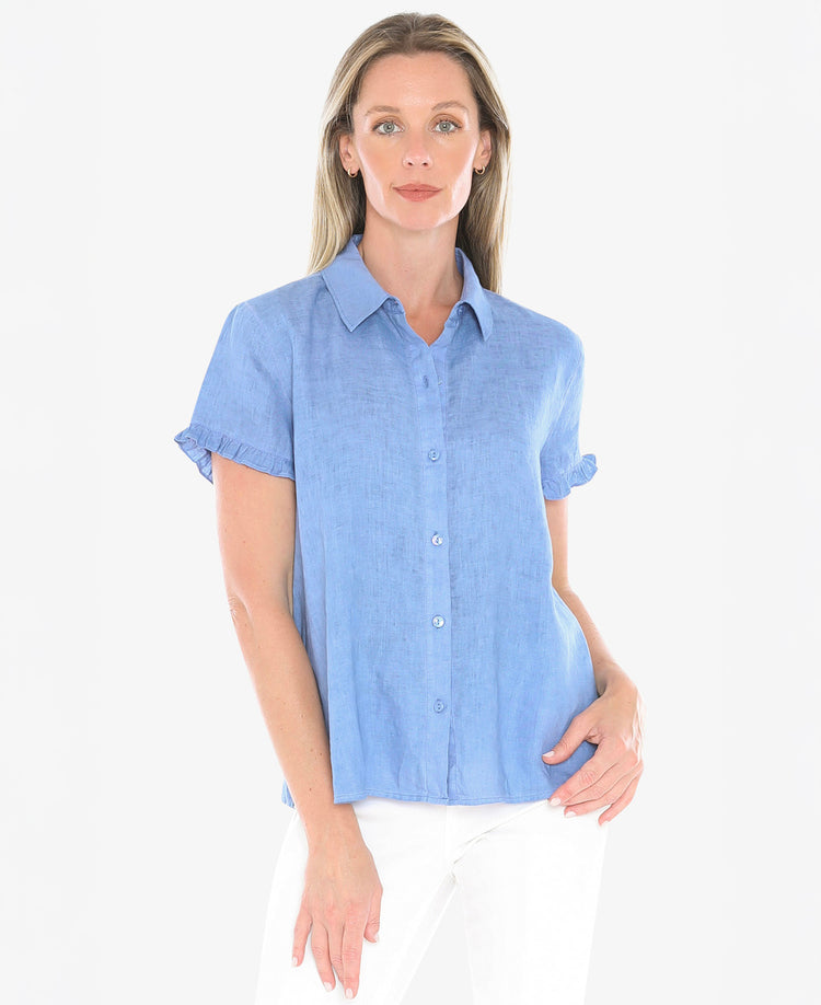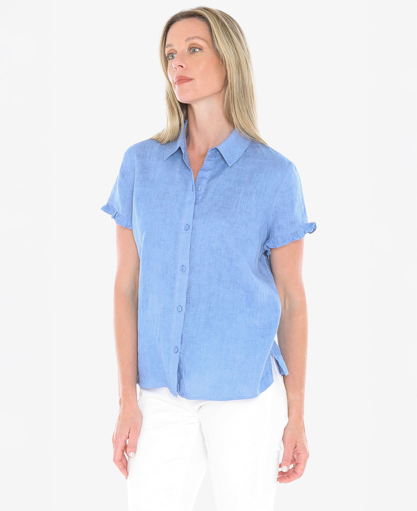 The Pigment Dyed Ruffle Sleeve Shirt brings a feminine flair to everyday dressing with its soft linen feel and delicate sleeve ruffles. Finished with a gentle washed effect, it offers a relaxed, lived-in look.
