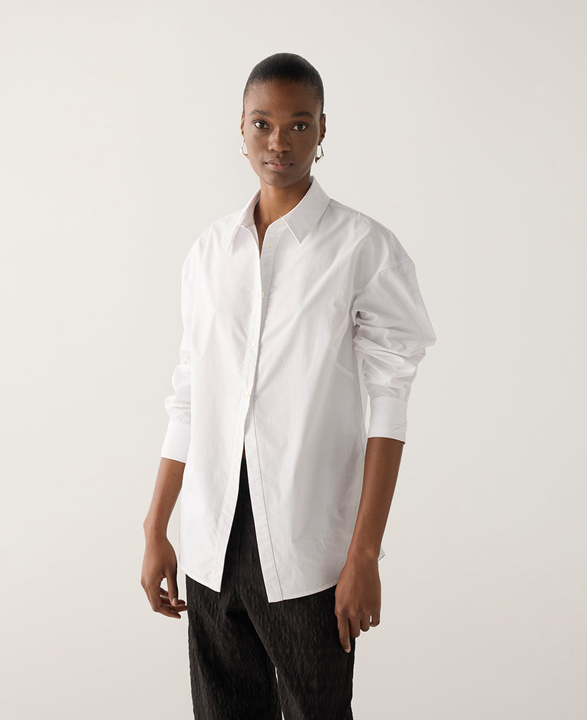 This shirt redefines the classic silhouette with refined architectural touches. Crafted from crisp organic cotton poplin, it features a clean front placket with a cut-out hem designed to create a flattering line through the body. The sleeves finish with a folded cuff detail, evoking a subtle origami-inspired structure that brings quiet sophistication to its relaxed shape. A timeless piece with modern intention.