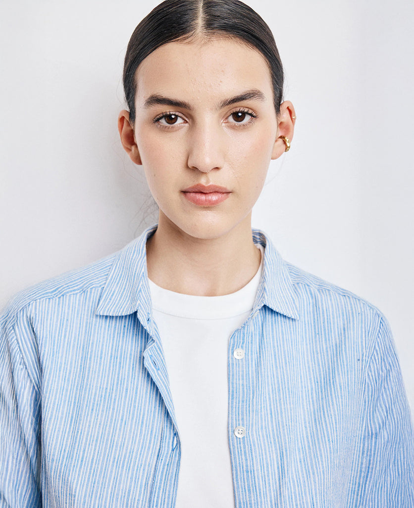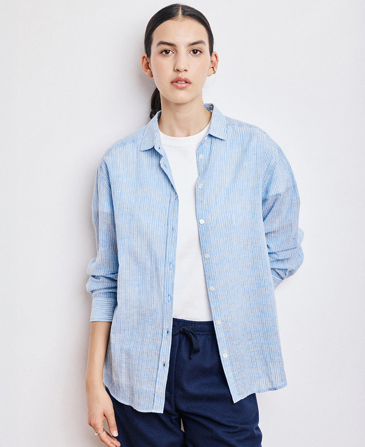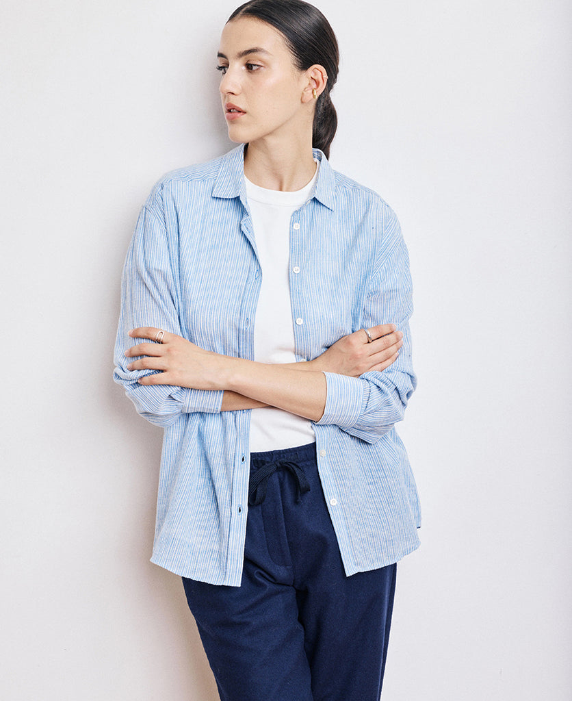 It features an exposed button placket with delicate mother-of-pearl buttons, and a rounded liquette hem for a soft, feminine finish. A light shirt, to be worn alone or layered as you wish.