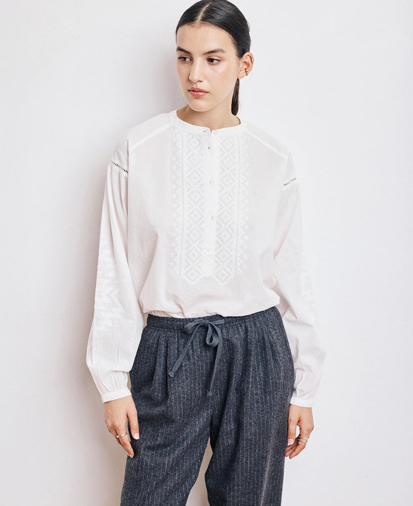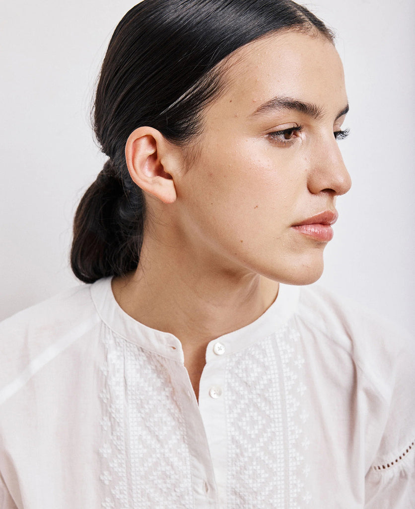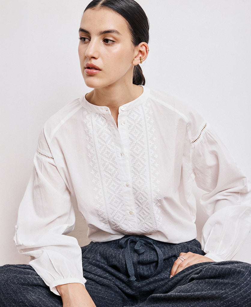 The Celeste Blouse combines ample volume and delicate embroidered details for a feminine, bohemian look. Made from a Cotton Voile lightweight fabric, it stands out for its finely embroidered bib and sleeves, highlighting the craftsmanship. Openwork details on the shoulders complete this subtly crafted piece.
