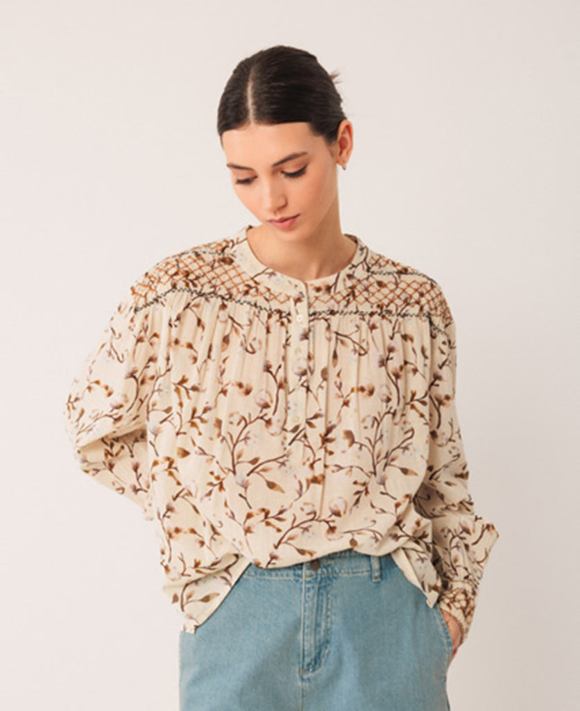 Elevate your everyday wardrobe with this beautifully detailed blouse, blending romantic vintage-inspired accents with a modern, sustainable edge. The "Marron" floral print offers a sophisticated, earthy aesthetic that pairs perfectly with denim or tailored trousers.