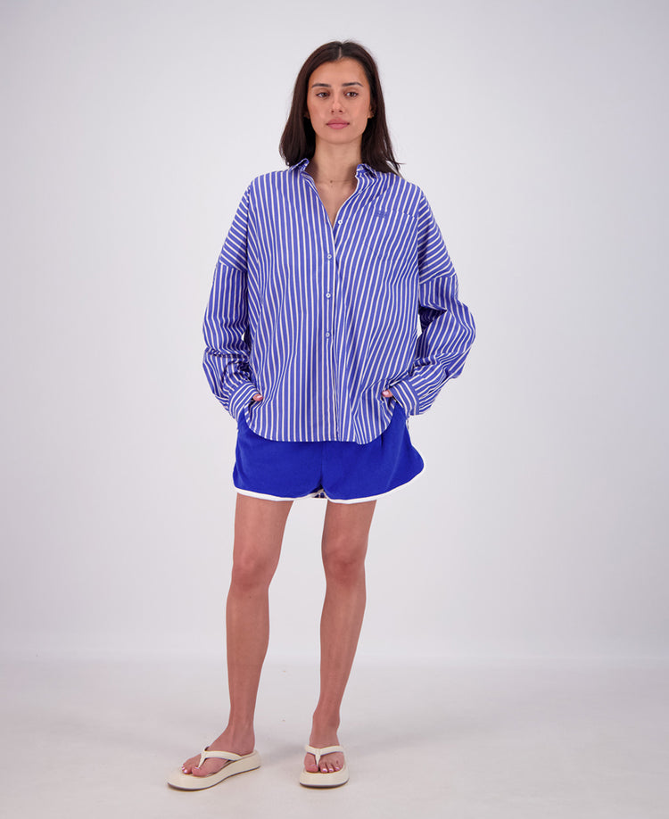 Effortlessly chic, the Mahalo Shirt is a go to striped shirt you’ll reach for season after season. Crafted with an oversized, relaxed fit for all day wear, it features a front button-down placket, button-up cuffs, and a back yoke for a polished finish, while the patch pocket with embroidered details adds a subtle touch of character. The scoop hem with side curve gives movement and shape, making this shirt a versatile piece for both casual and elevated looks.