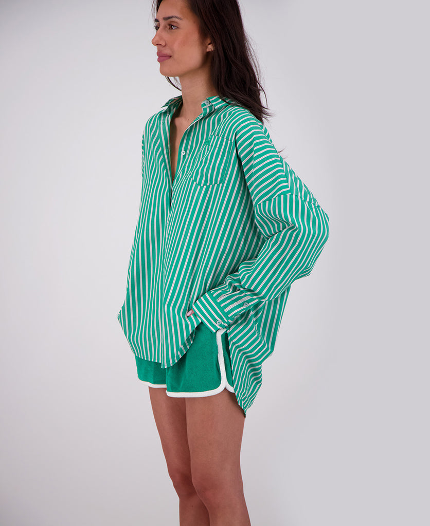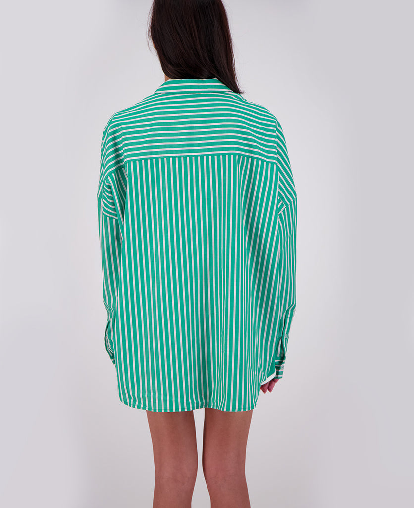 Effortlessly chic, the Mahalo Shirt is a go-to striped shirt you’ll reach for season after season. Crafted with an oversized, relaxed fit for all-day wear, it features a front button-down placket, button-up cuffs, and a back yoke for a polished finish, while the patch pocket with embroidered details adds a subtle touch of character. The scoop hem with side curve gives movement and shape, making this shirt a versatile piece for both casual and elevated looks.