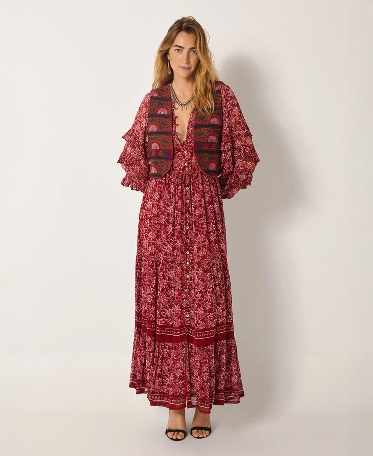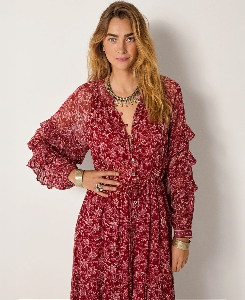 Introducing the Harper Dress in Ruby, a georgette viscose dress that effortlessly blends elegance and edge. Featuring the striking Red Lion print, this red floral dress showcases a rich crimson base adorned with delicate florals and framed by refined hem borders, creating a textured and soulful print. The Harper Dress silhouette flows beautifully with a cinched waist for flattering shape, while voluminous ruffled sleeves add a touch of theatrical flair. Tiered panels cascade toward the hem, giving movement and rhythm with every step.