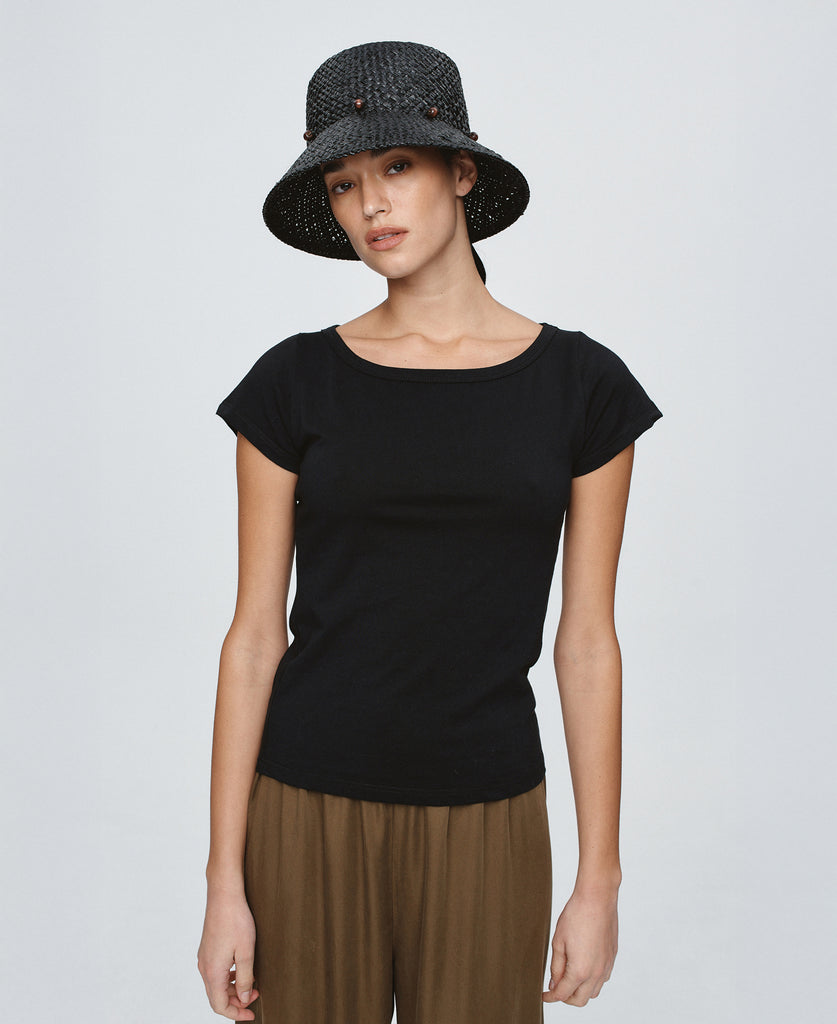 The Avia Hat is a structured bucket shape in 100% raffia. It features a mid depth crown and a slightly flared brim for balanced proportion and subtle volume. Each hat is detailed with a series of small hand applied wooden beads encircling the crown, lending texture and a crafted finish.