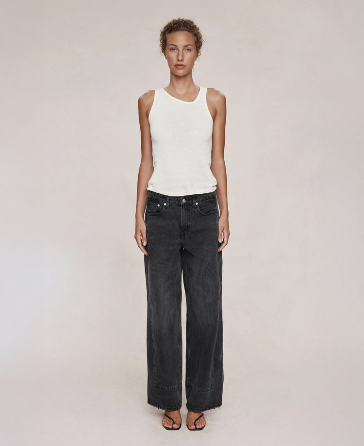 Crafted from pure organic cotton, this wide-leg jean offers understated elegance with its mid-rise silhouette and generous proportions through the hip and thigh. The timeless five-pocket construction pairs with a zip fly and button closure, while belt loops anchor the waistband. Distinctive contrast panelling along the sides and hem creates a refined border accent that elevates the classic denim aesthetic.