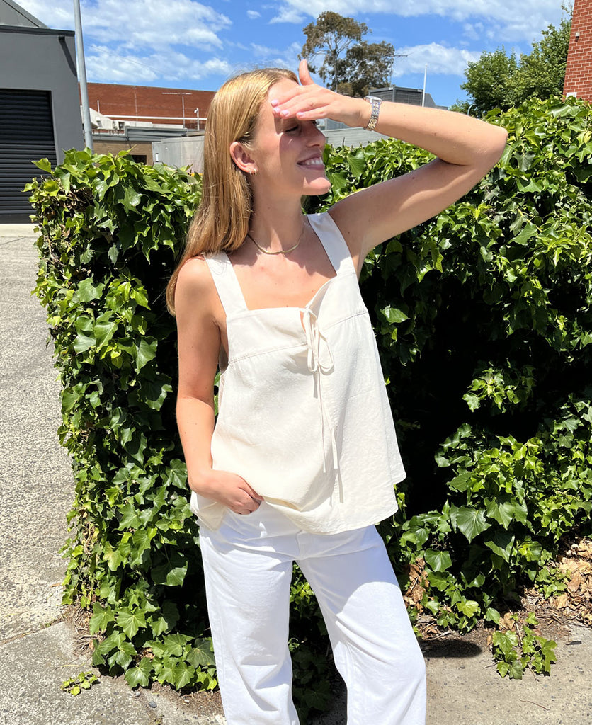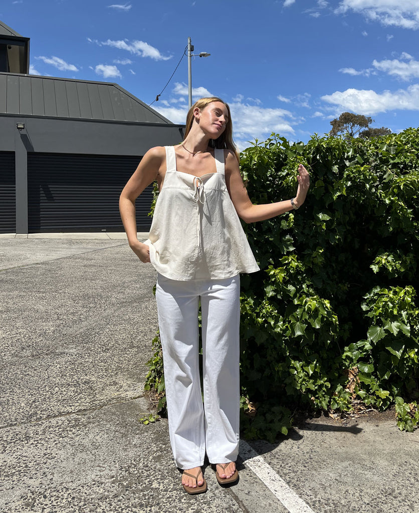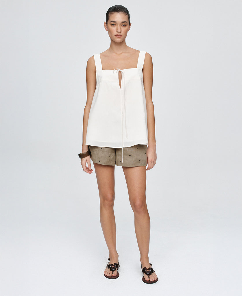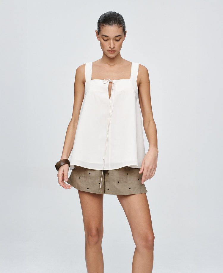 The Dodi Top is cut from 100% cotton with a soft yet structured hand feel. Defined by its square neckline and voluminous A-line shape through the hips, the design features wide straps that extend over the shoulders and fasten at the back with buttoned tabs. A centre-front split opening with a rouleau tie closure punctuates the neckline, offering adjustability and subtle detail.