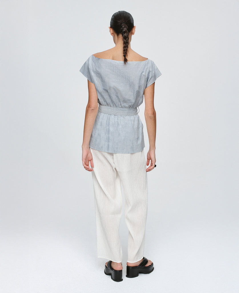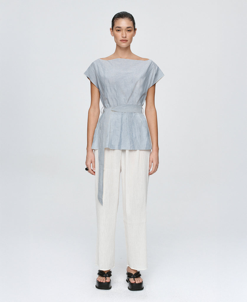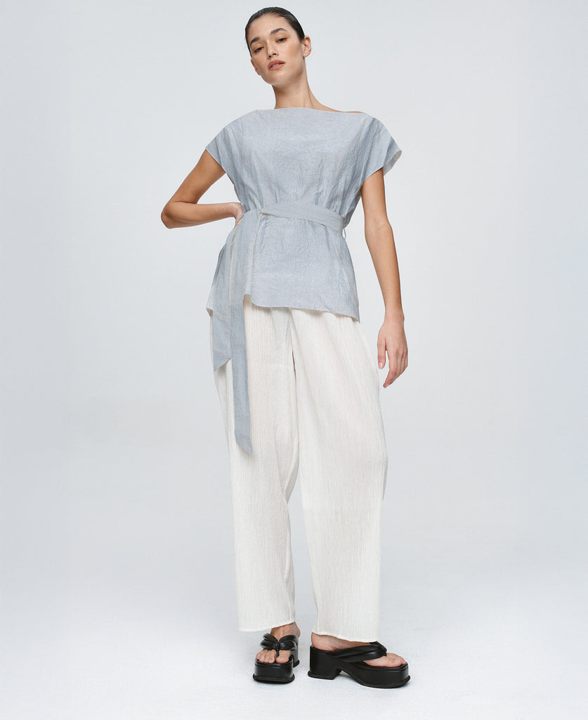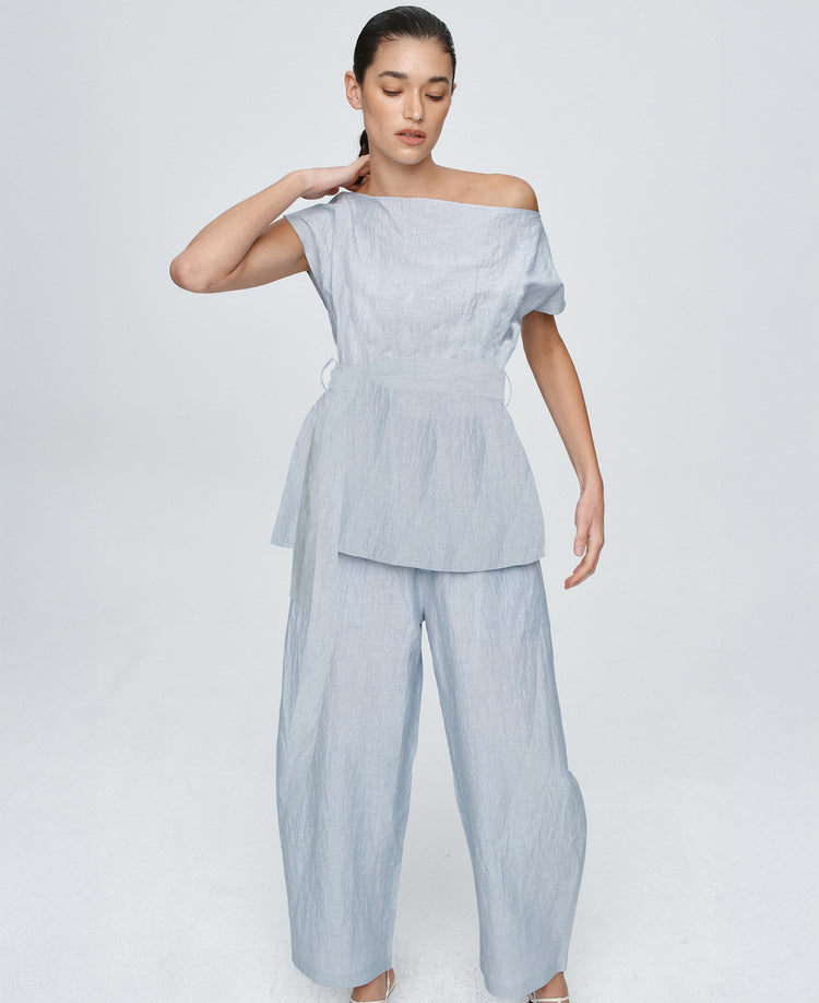 Sculptural yet softly undone, the Jude top is reimagined in a crisp linen-cotton. Designed with an off-the-shoulder neckline and relaxed fit through the body. The waist is cinched with a removable self-fabric tie, threaded through narrow belt loops for adjustable shaping. Clean-finished neckline, armholes and hem.
