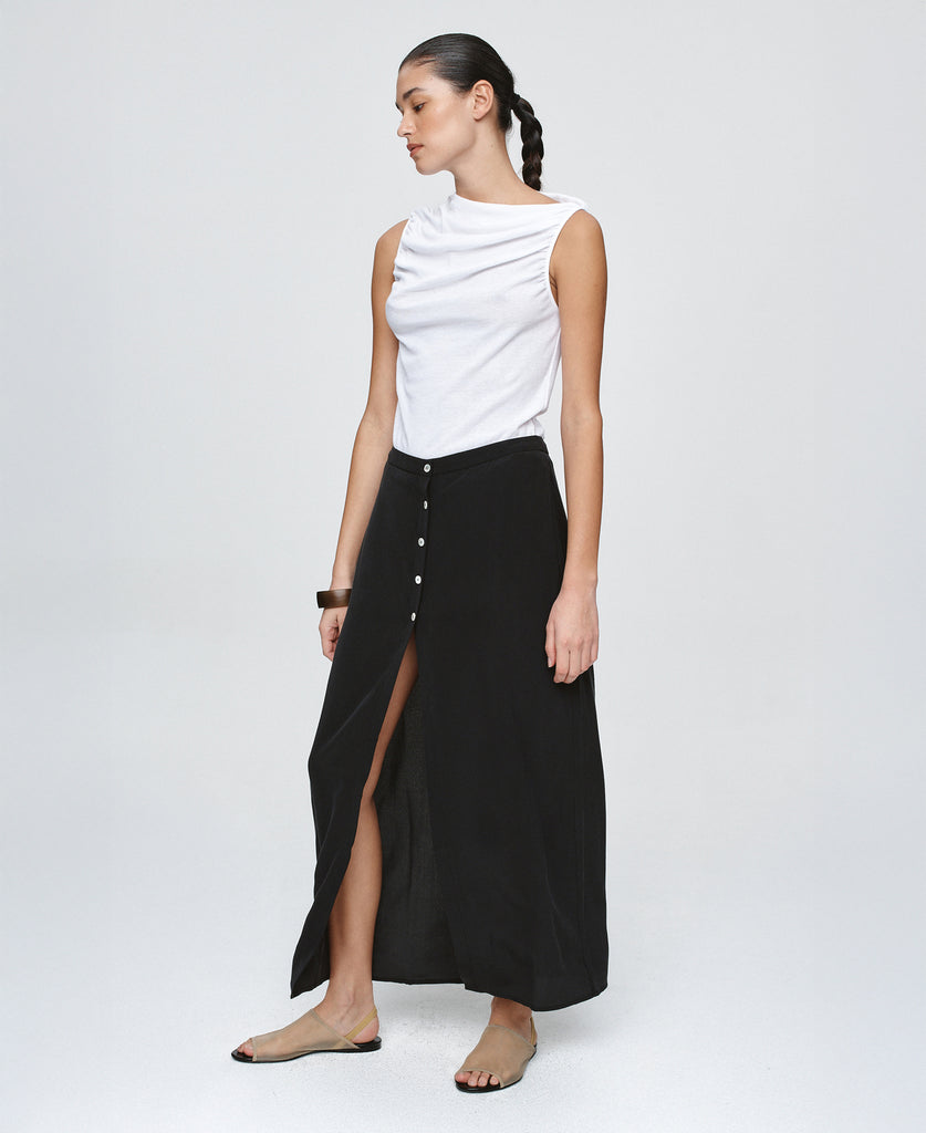 The Louella Skirt is a full-length, button-through maxi skirt crafted from 100% silk for a fluid, elegant drape and natural sheen. This skirt features a straight shape that softly skims the body and falls to the ankle. The front placket is finished with a line of 5 contrast shell buttons for closure. A subtle front slit adds movement and ease, while the waistband sits comfortably at the natural waist for a streamlined fit.