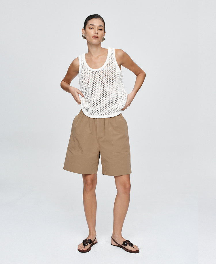The Nova Top is crafted in 100% Cotton, offering a textured open knit. Designed with a scooped neckline at the front and back, it falls to a relaxed, boxy shape that layers effortlessly over simple foundations. The deliberate looseness of the weave creates an airy, unstructured quality.