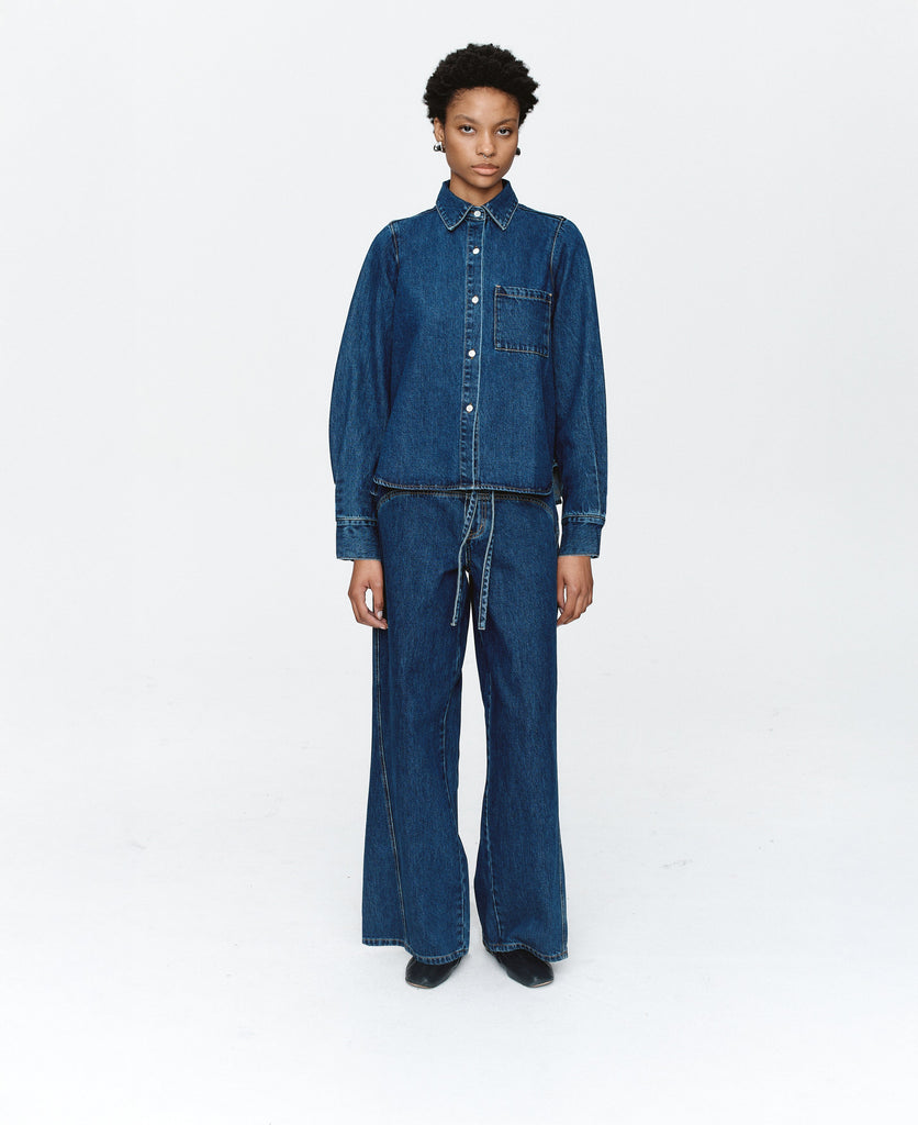 The Pearl Shirt is crafted from Marle's signature 100% organic cotton denim. This timeless shirt features long sleeves, a classic collar, and a single breast pocket, all secured with shell buttons that contrast gently against the blue denim. Designed to sit at the hip, it has a shorter length with a curved hem. The long sleeves are finished with tucks and matching shell button cuffs for a polished look.