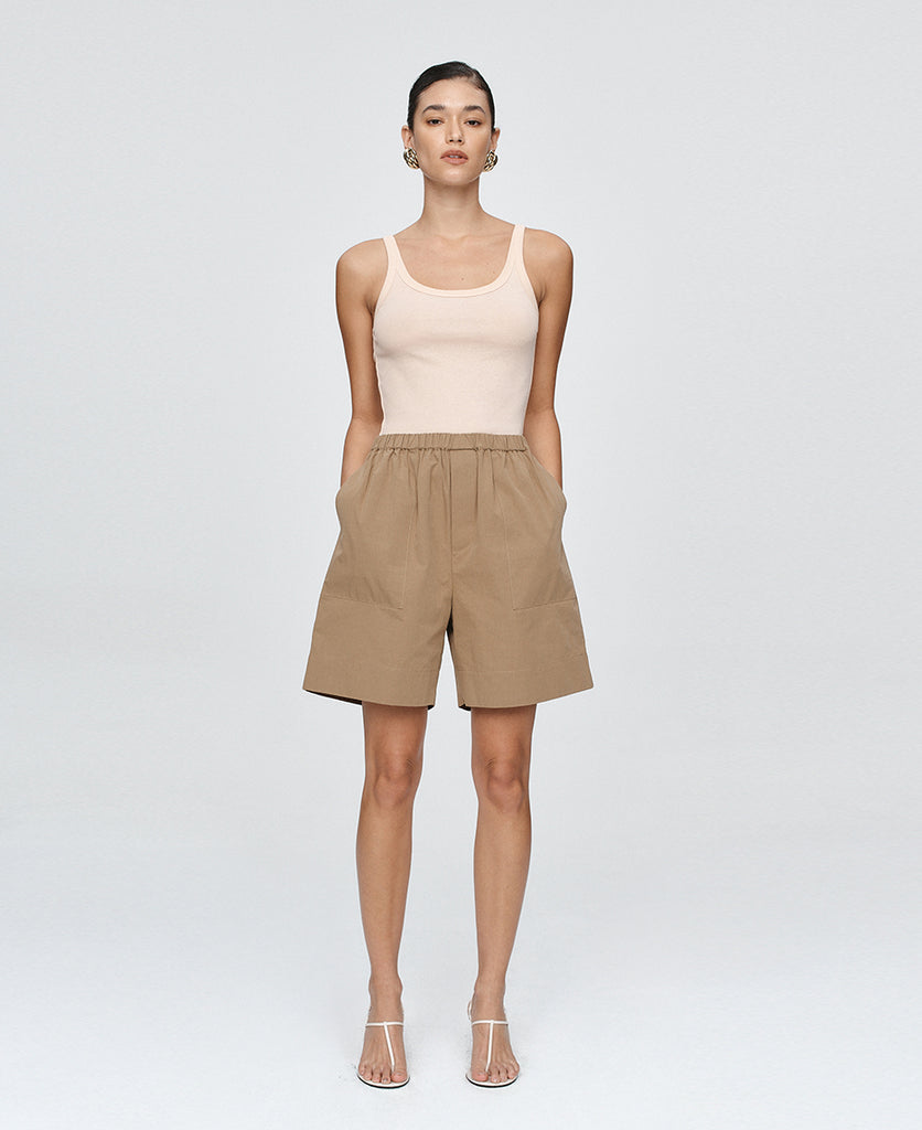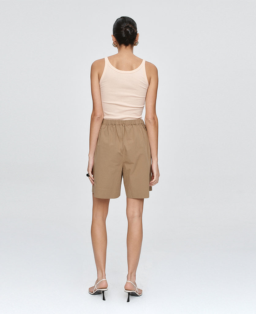 Relaxed-fit shorts crafted from a lightweight 100% cotton selected for its crisp structure and comfort. The design features a fully elasticated waistband for ease of wear and flexible fit. A mock fly is incorporated at the centre front to reference traditional tailoring details while retaining a pull-on construction. The Ren short is equipped with oversized front pockets and finished with a topstitched deep hem.