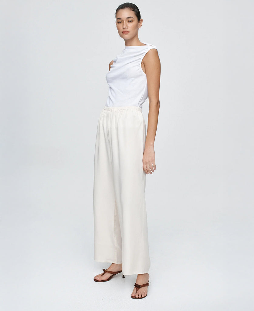 The Renee Pant is a signature Marle shape. Crafted from a lightweight 100% Tencel, this iteration offers drape and fluidity. Designed to sit high on the waist, it features a thin elasticated waistband with a delicate rouleau tie. The straight leg gently tapers toward the ankle, falling to a semi-cropped length for a relaxed yet polished finish.