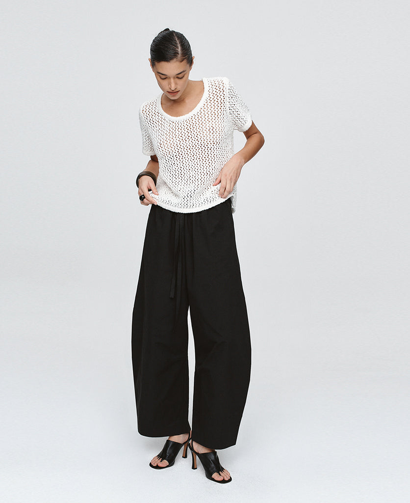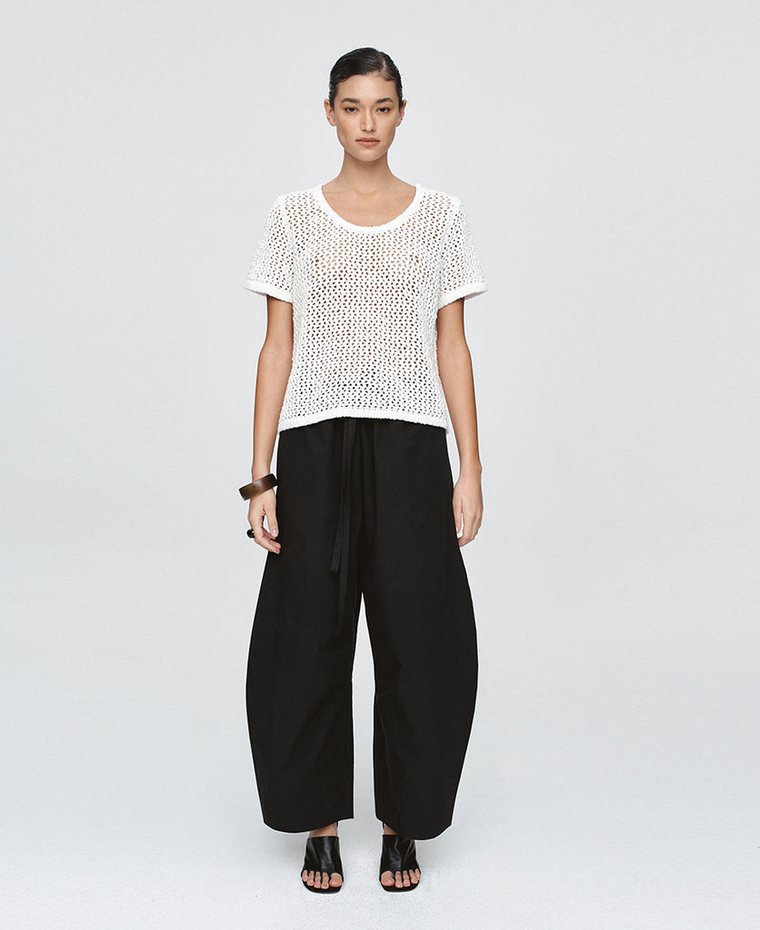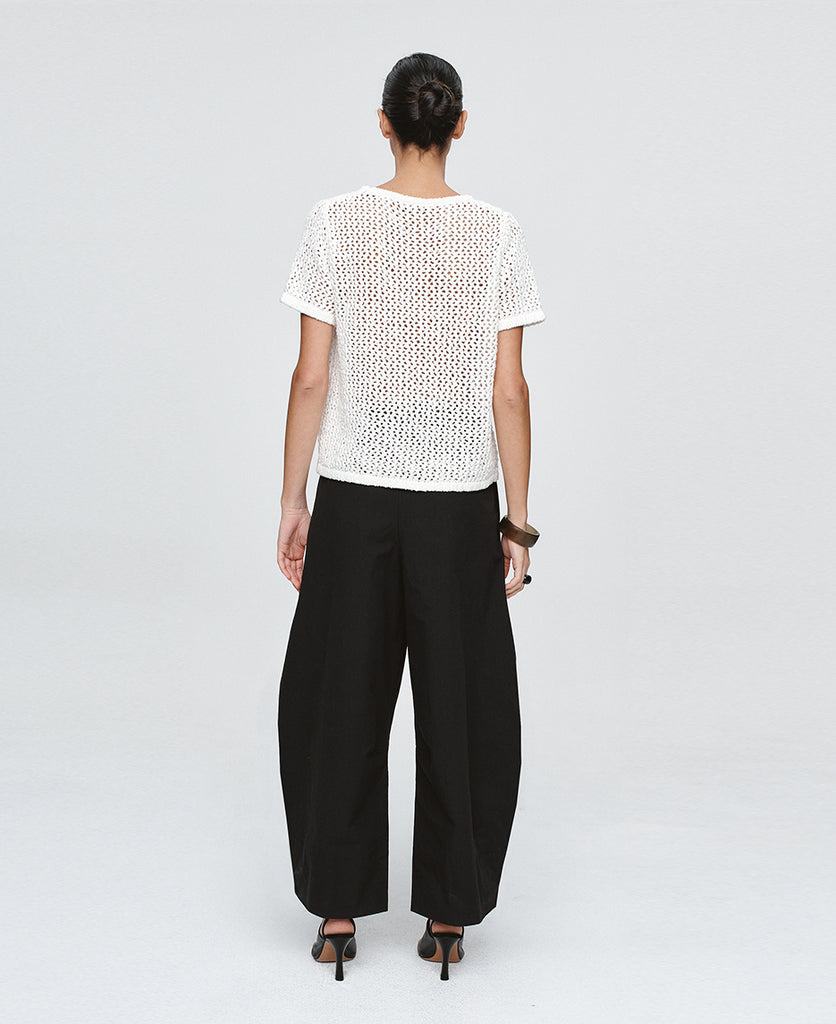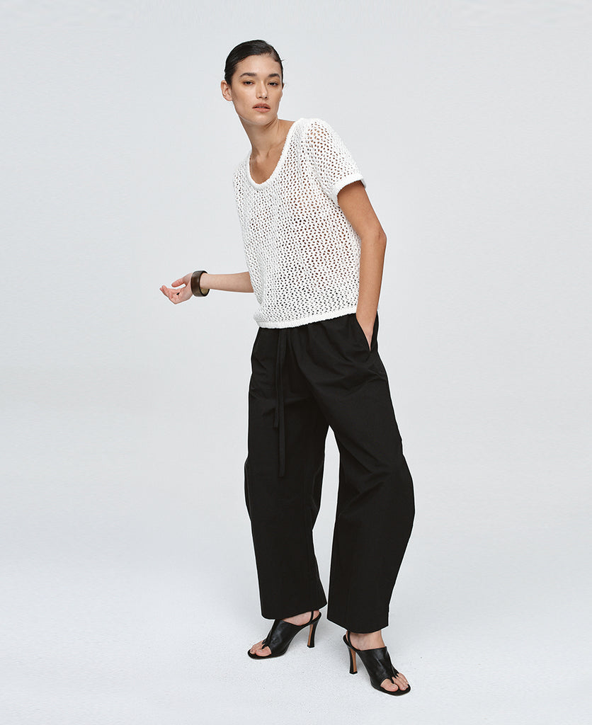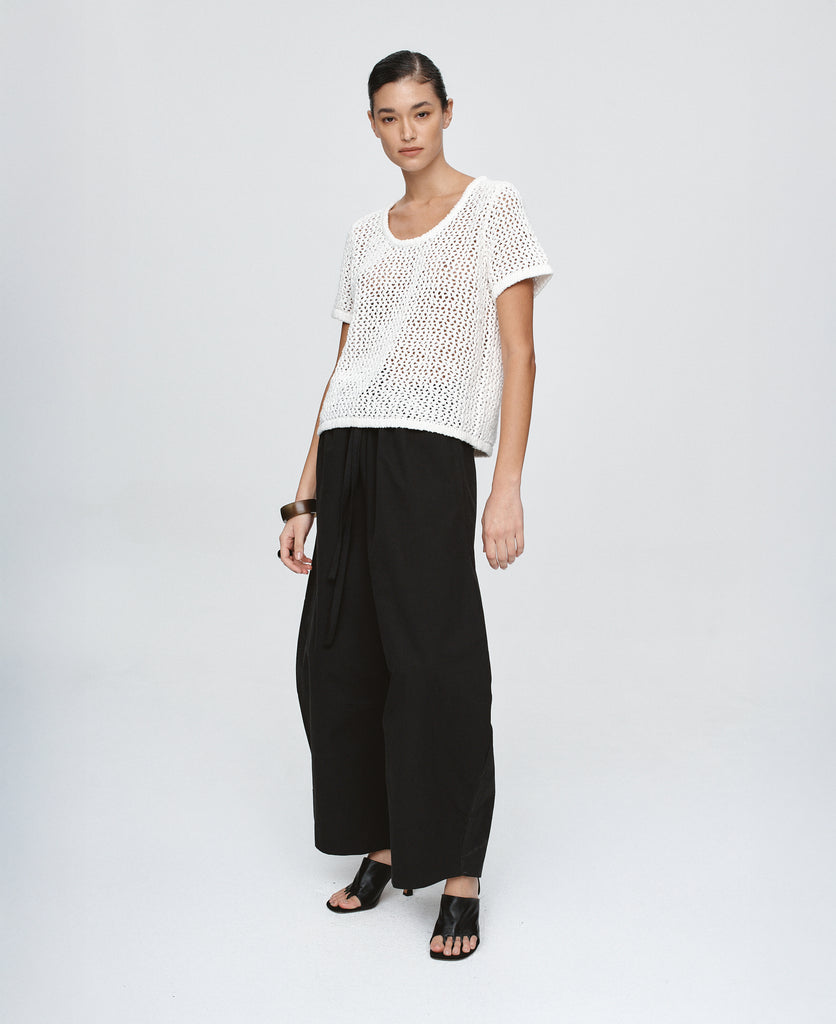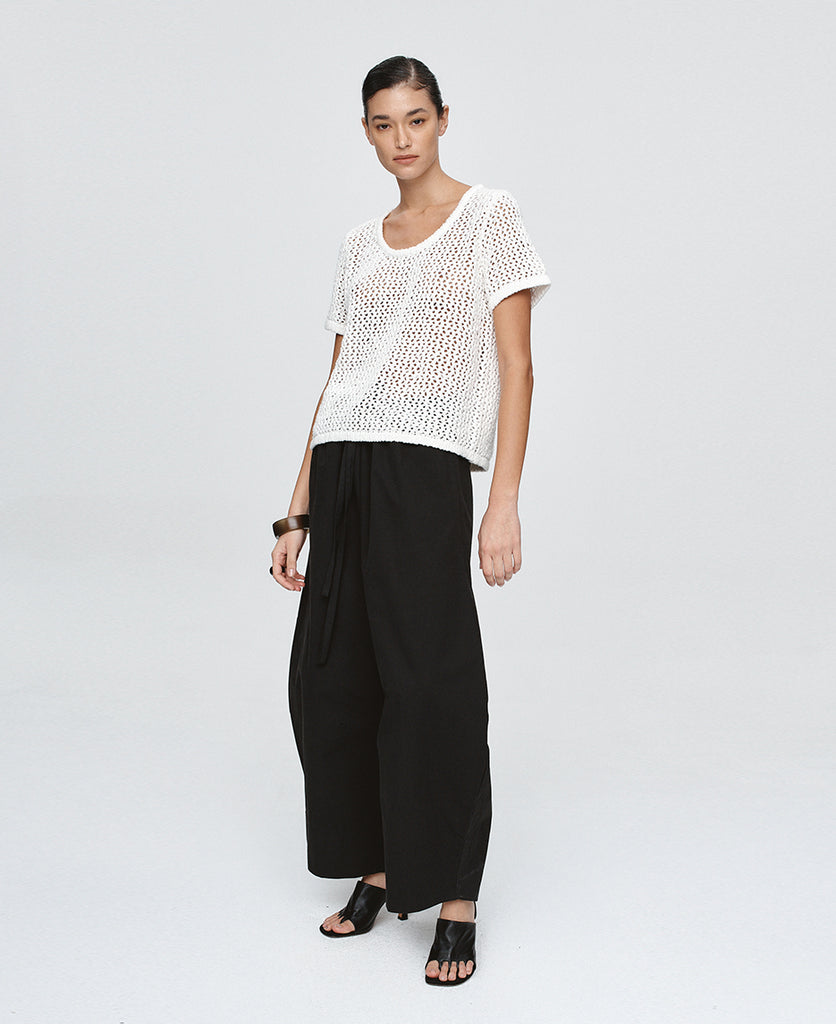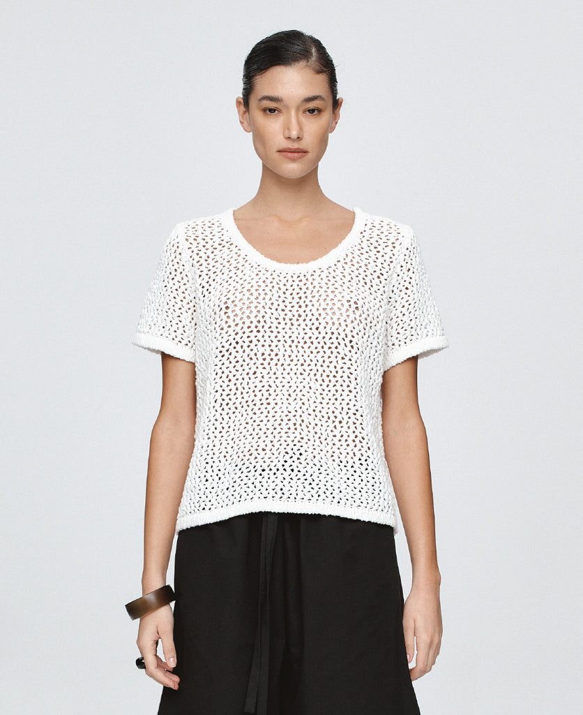 The Rumi Top is crafted in 100% Cotton, offering a textured open knit. Designed with a scooped neckline at the front, it falls to a relaxed, boxy shape that layers effortlessly over simple foundations. The deliberate looseness of the weave creates an airy, unstructured quality.