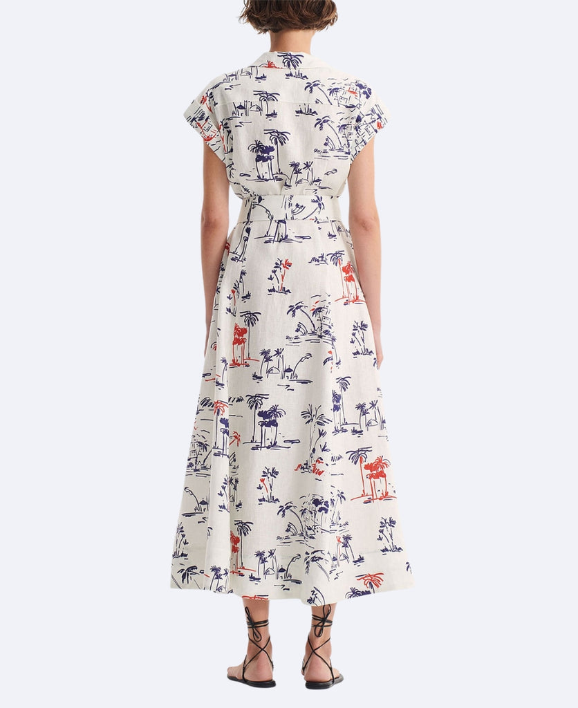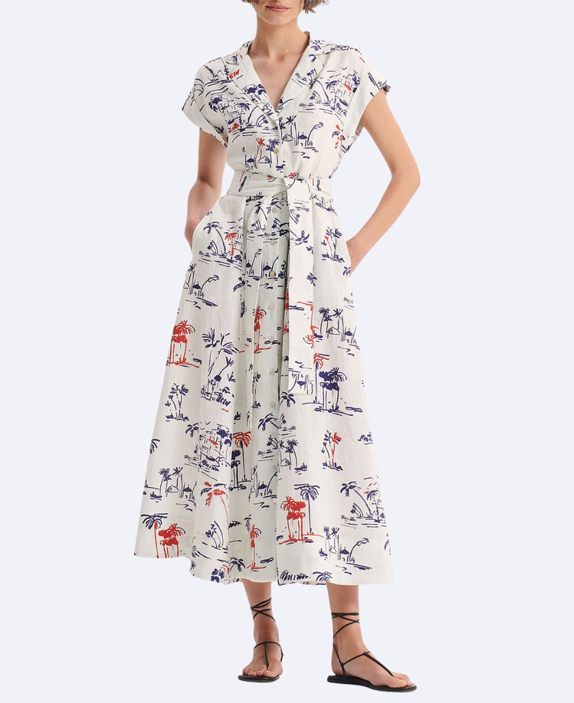 Crafted from midweight linen, this elegant shirt dress features an exclusive Morrison print that captures effortless resort style. The refined resort collar and cuffed cap sleeves create a polished silhouette, while the neat-fitting bodice transitions into a gracefully panelled skirt with a flattering waist definition. A button-through front and coordinating self-fabric waist tie offer versatile styling options, while the midi length and fitted waist ensure a sophisticated, flattering drape for any occasion.