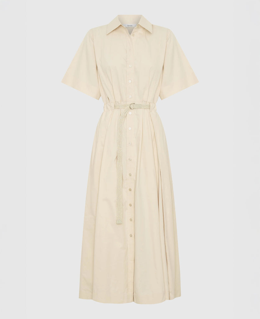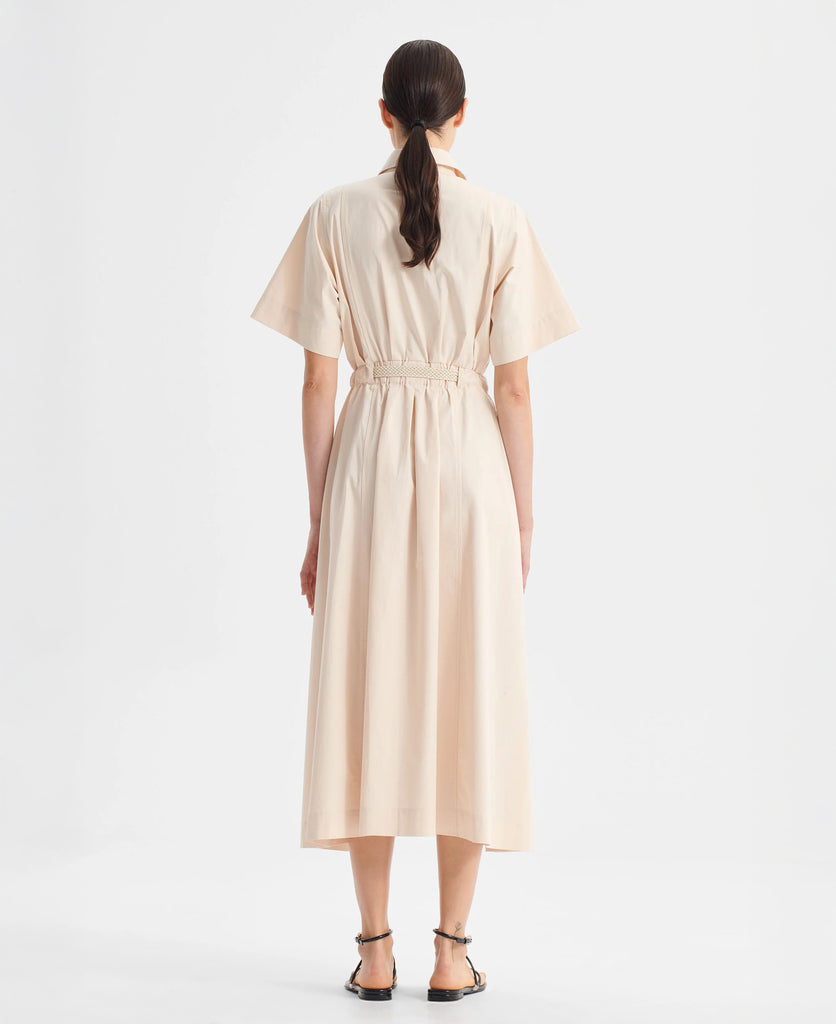Crafted in cotton twill, the Ingrid Shirt Dress combines structure with ease. A traditional collar, button front, and tailored bodice create polish, while short sleeves and tunnel waist detailing add interest. Finished with an A-line midi skirt and contrast belt, it’s a versatile piece for everyday or occasion wear.
