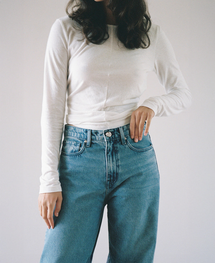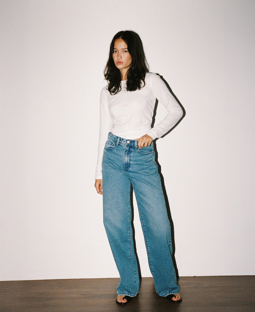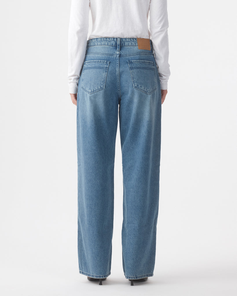 Discover the Olive Mid Rise Slouchy Marina Mid Blue Jean by Outland Denim, a classic piece designed in partnership with Olive Cook. This jean features a mid-rise waist that gently drapes into a relaxed dropped crotch and extends into a full-length wide leg. Crafted from high-quality rigid denim, it is distinguished by Olive's unique signature details for a refined, effortless style.