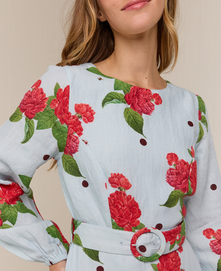 The Melrose Dress, printed in an exclusive Garden print, is crafted from a premium Linen. Fitted through the bust and waist and flowing into an A-Line Skirt, the Melrose Dress is designed to softly skim the body for a flattering fit. Featuring a rounded high neckline, blouson sleeves, a matching buckle belt and an ankle-length hem.