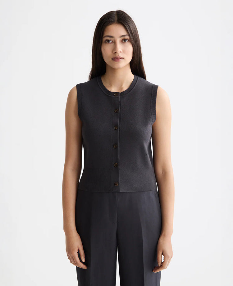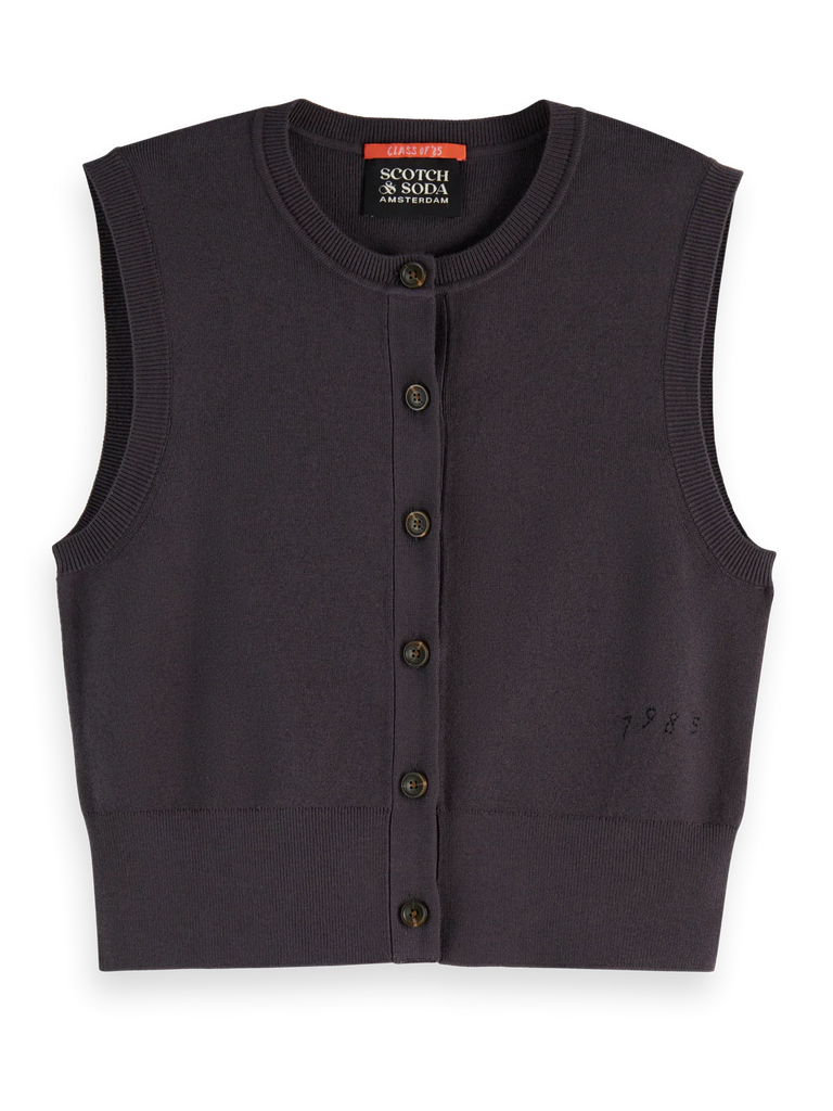 This knitted vest redefines the classic layering piece. It features a clean-lined silhouette designed for effortless creativity—wear it solo for a sharp aesthetic, or layered over crisp shirts to switch up your style. The button-front closure and ribbed hem ground the design, bringing a sense of quiet sophistication to this versatile closet staple.