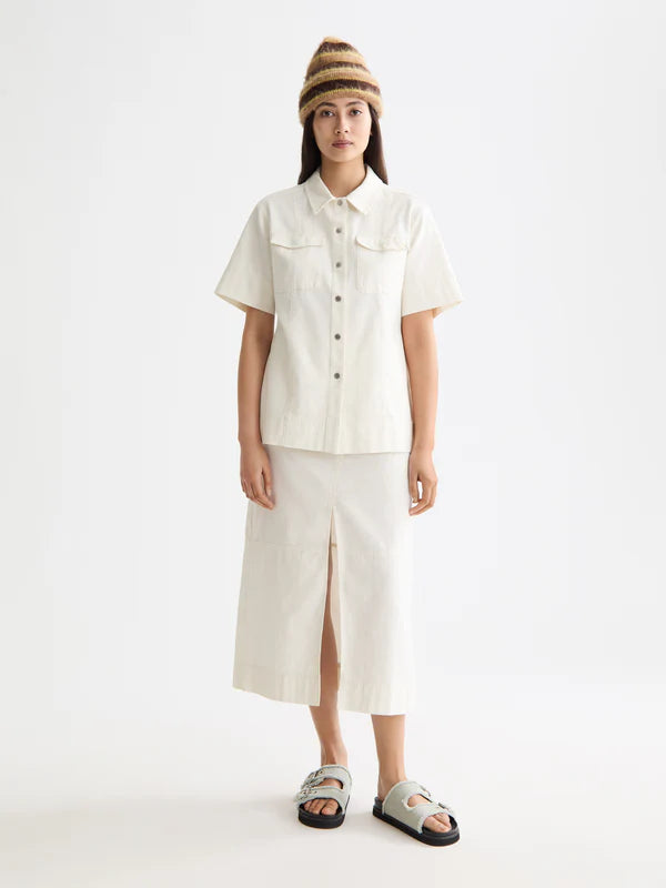 This structured midi skirt redefines utilitarian style with a clean, minimalist aesthetic. Crafted from premium black cotton, it features bold contrast stitching that highlights its precise geometric construction. The high-waisted, straight silhouette is designed to graze the ankle, balanced by a centered front slit for modern movement and ease.