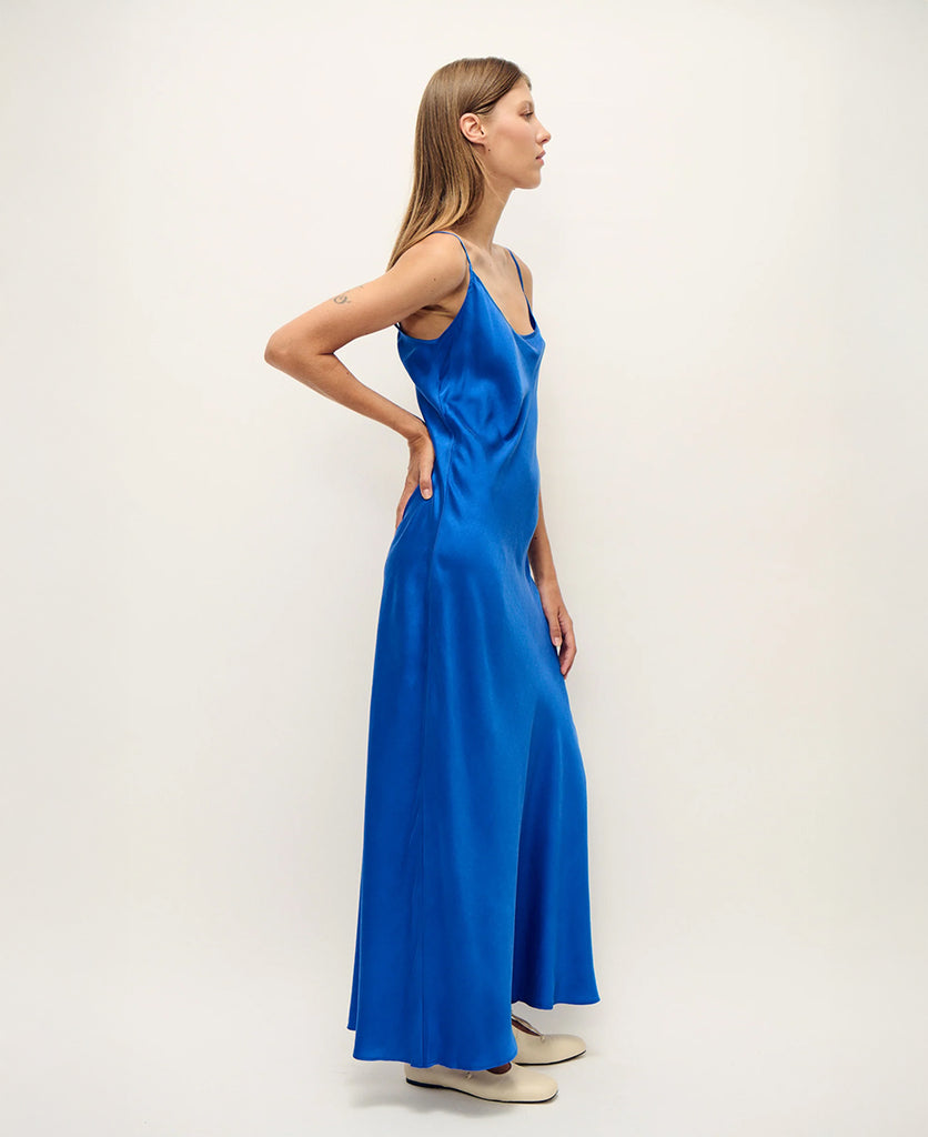 The Silk Laundry 1996 Wedgwood Dress, adorned with the signature Paisley Blue print and playful hound detail, is a timeless design inspired by Silk Laundry's original uniform print. Crafted from 100% silk, it features a flattering round neckline, adjustable straps, and a bias cut that elegantly drapes to a full-length hemline.