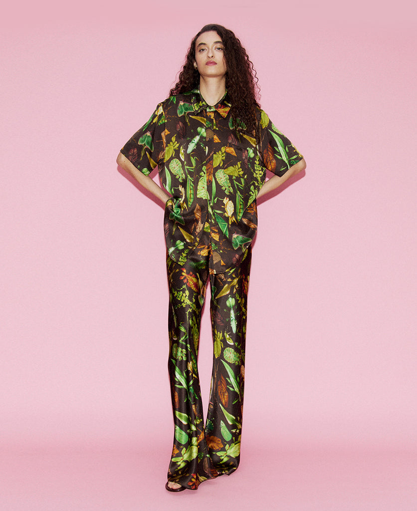 Embrace effortless elegance in the Boyfriend Bug Camp SS Shirt by Silk Laundry. Constructed entirely from luxurious silk. Featuring a classic button-down front and practical utility pockets, it channels timeless menswear aesthetics with a deliberately relaxed silhouette. The distinctive Bug Camo Print adds contemporary visual interest to this wardrobe essential, making it equally suited to casual weekends or layered styling.